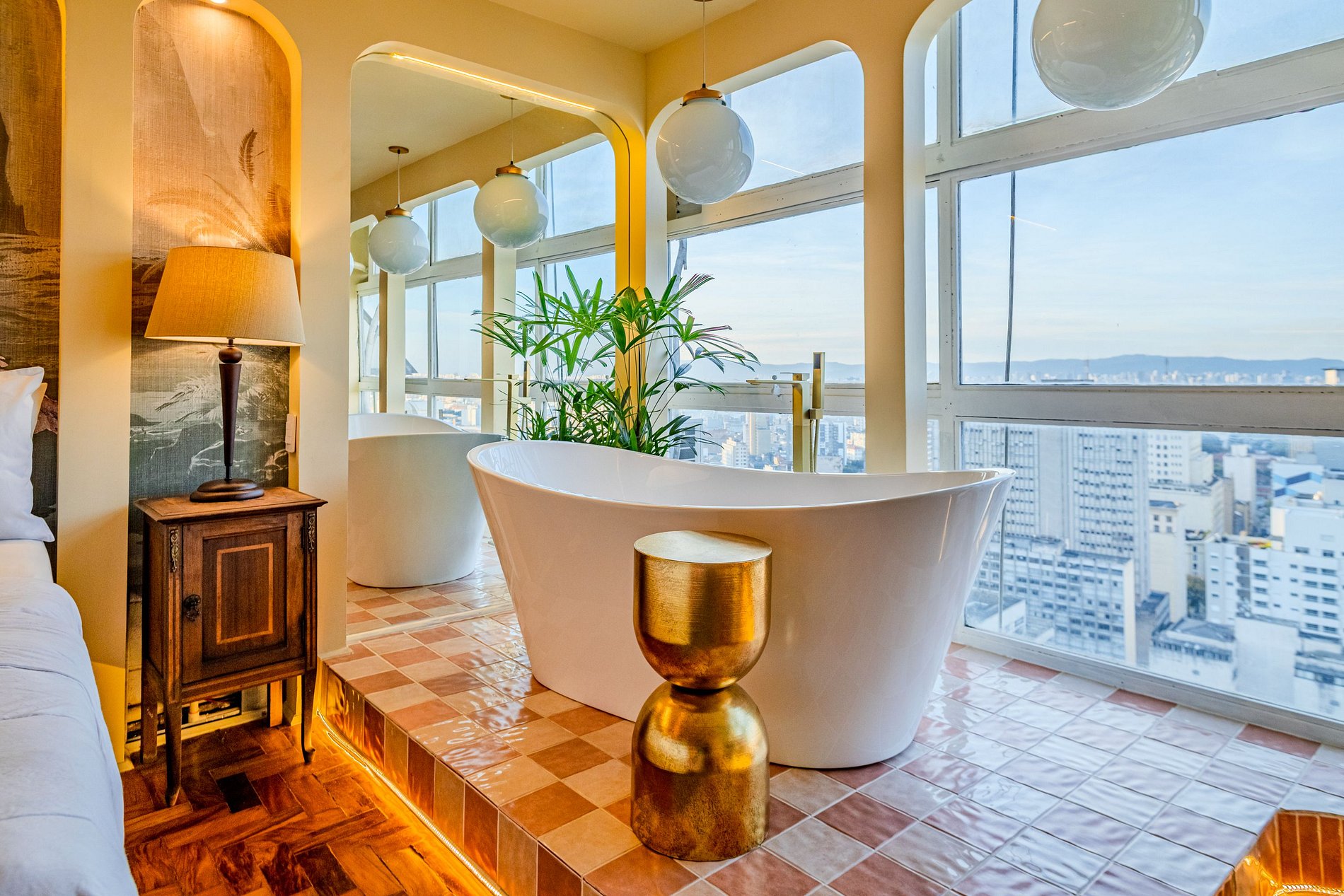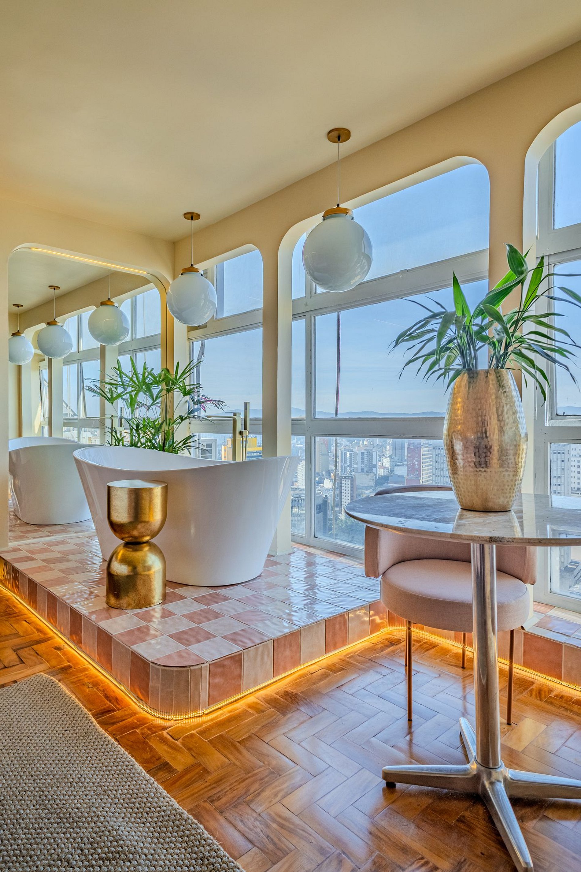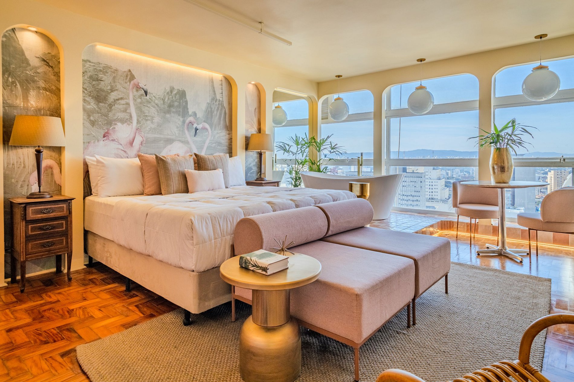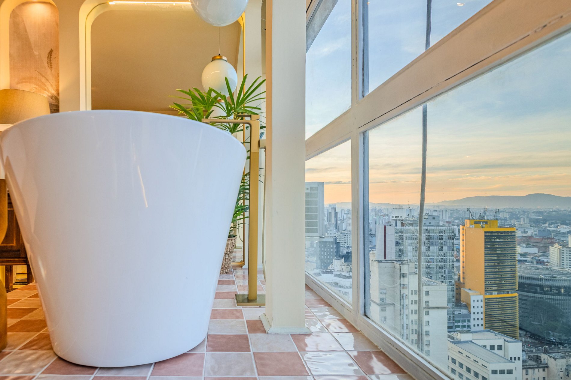 Apaixone-se pela vista deslumbrante do 37º andar deste apartamento único em São Paulo. Em um dos edifícios mais históricos da cidade, o imóvel oferece um ambiente charmoso e sofisticado, com uma banheira ao lado da janela, persianas automatizadas para uma experiência INCRIVEL.