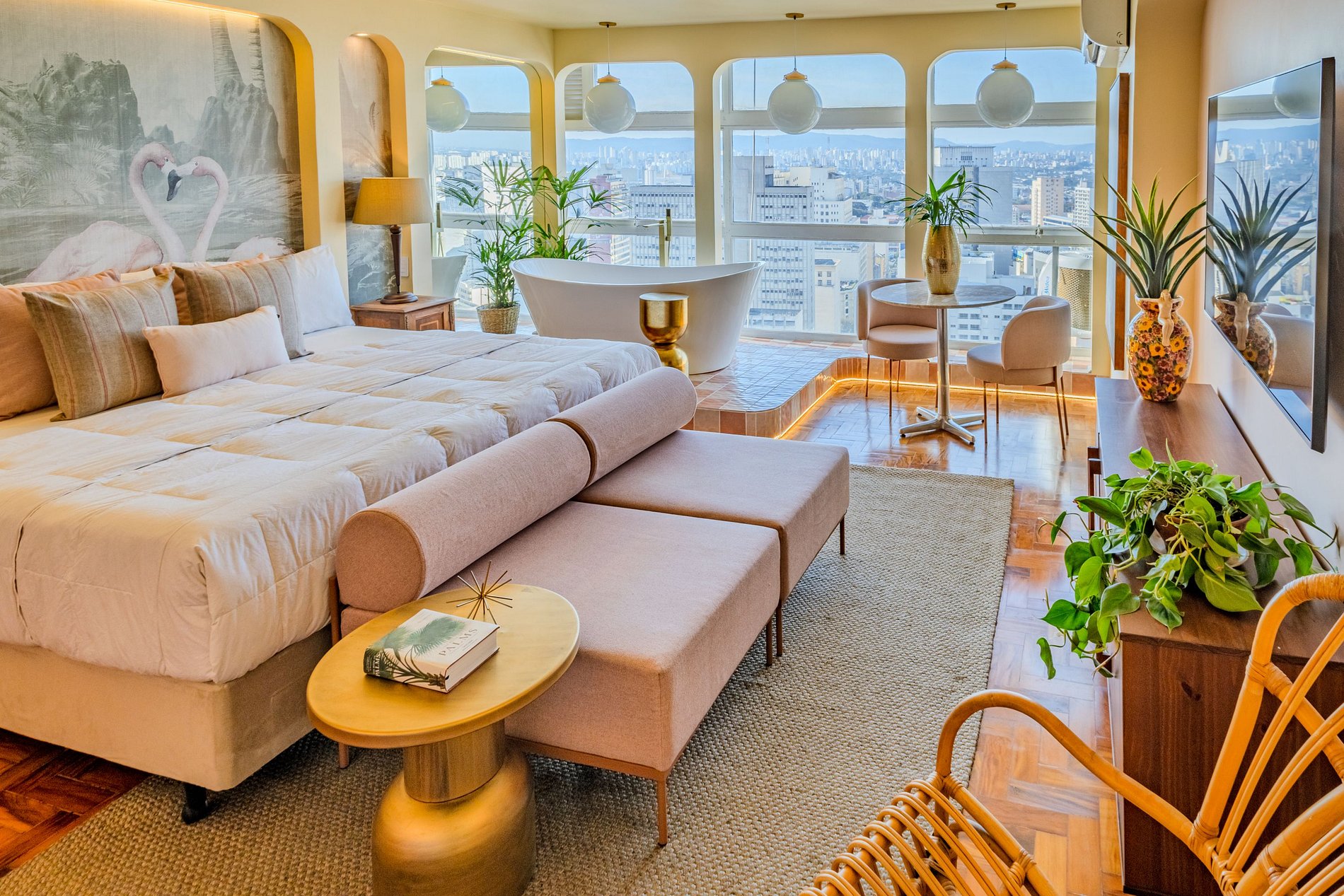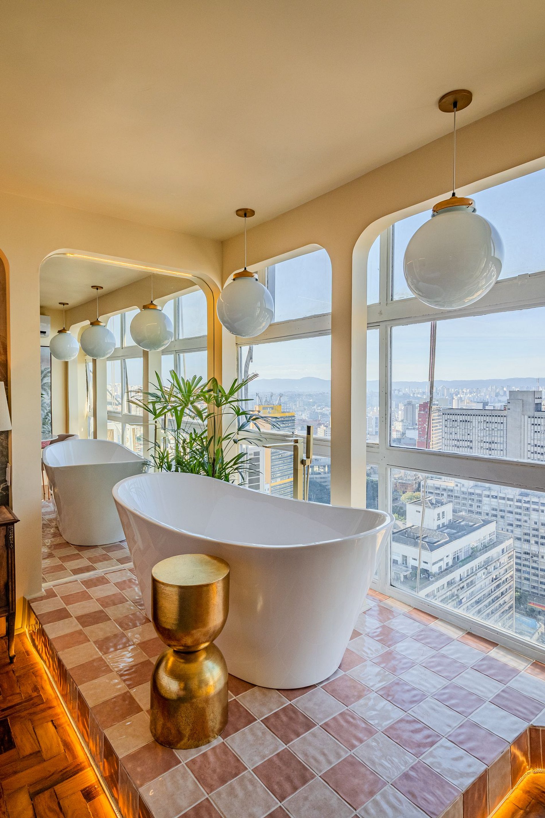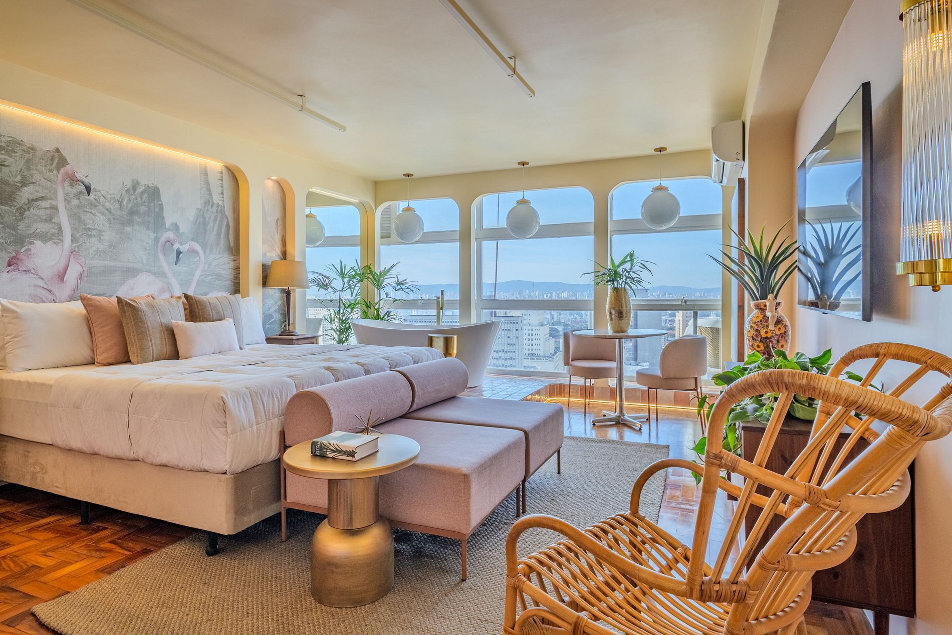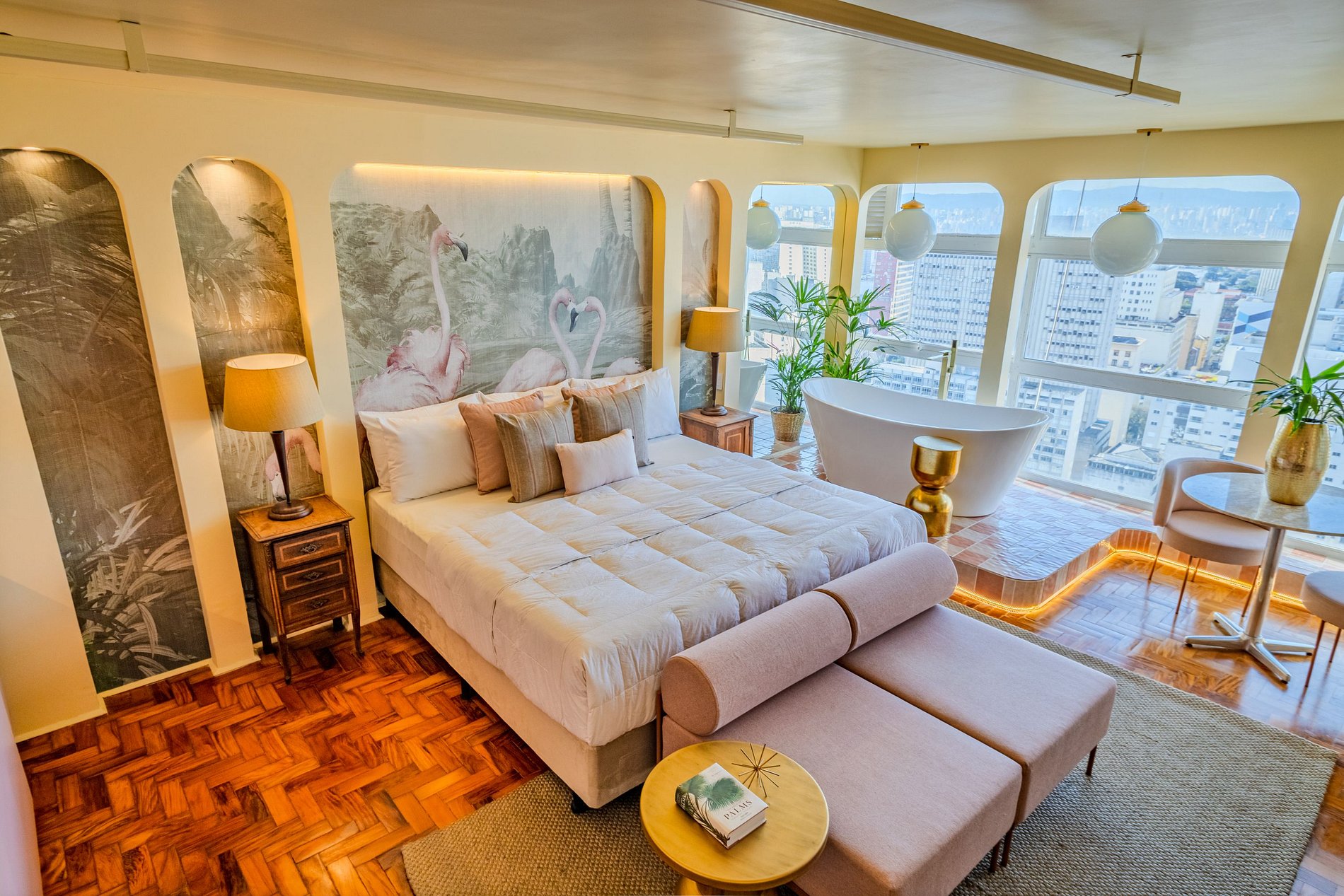 Apaixone-se pela vista deslumbrante do 37º andar deste apartamento único em São Paulo. Em um dos edifícios mais históricos da cidade, o imóvel oferece um ambiente charmoso e sofisticado, com uma banheira ao lado da janela, persianas automatizadas para uma experiência INCRIVEL.