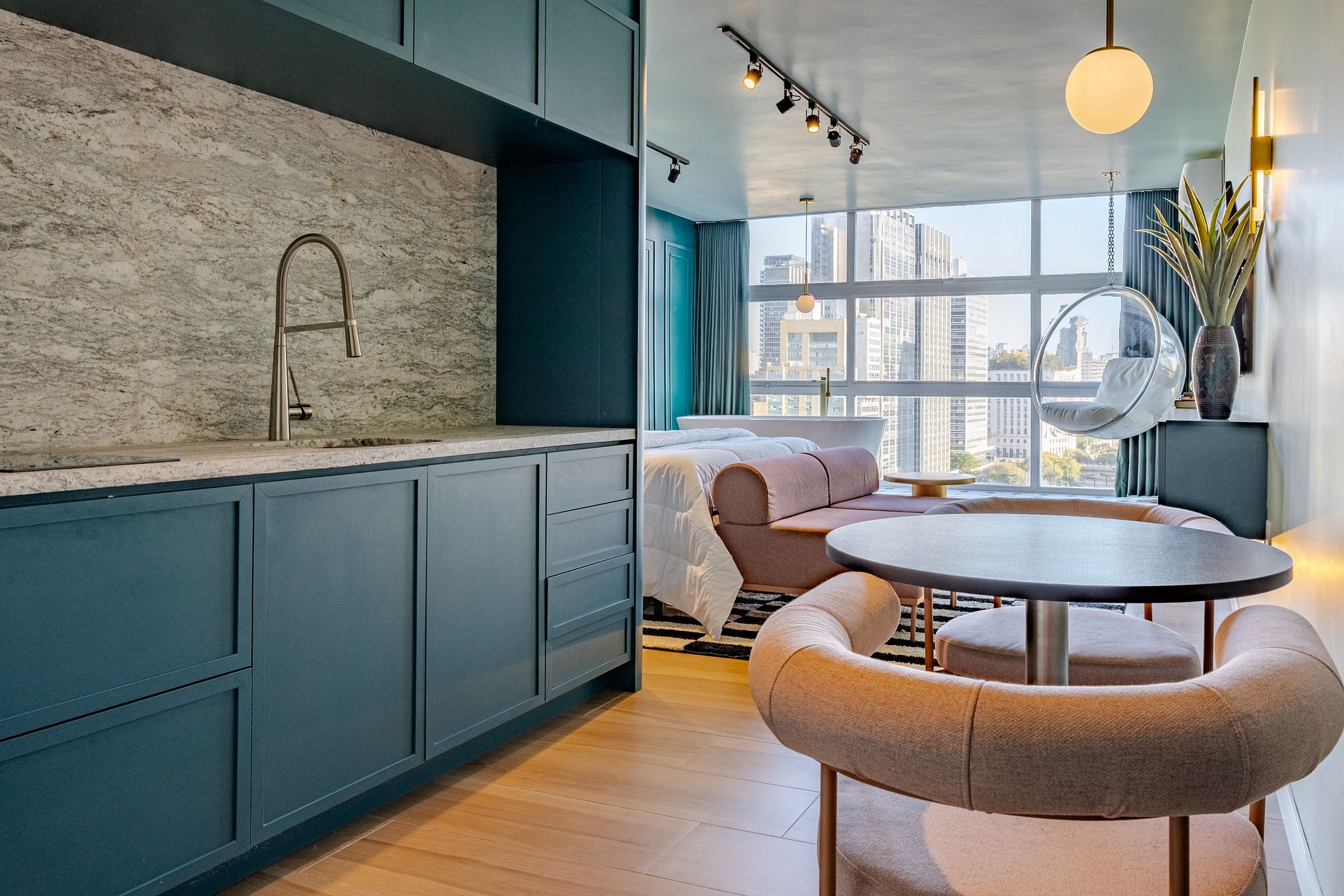A suíte conta com uma cama queen de excelente qualidade, enxoval macio e uma ambientação pensada para o seu descanso. A cozinha está equipada para refeições práticas e a sala convida para um vinho admirando a paisagem urbana.