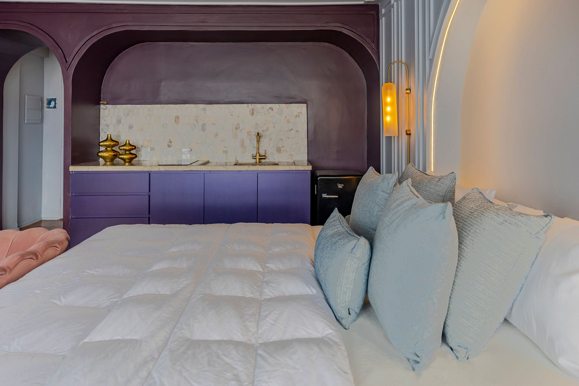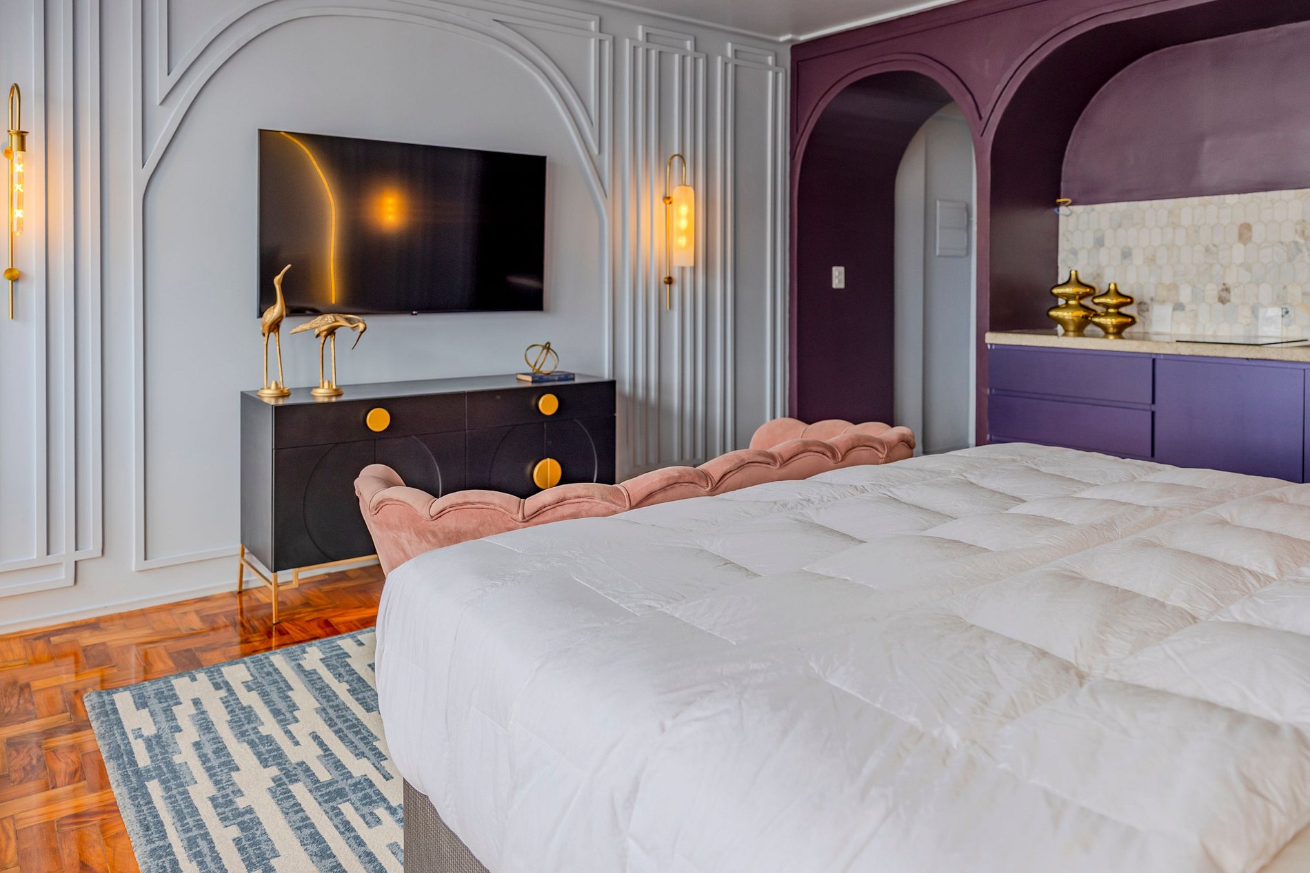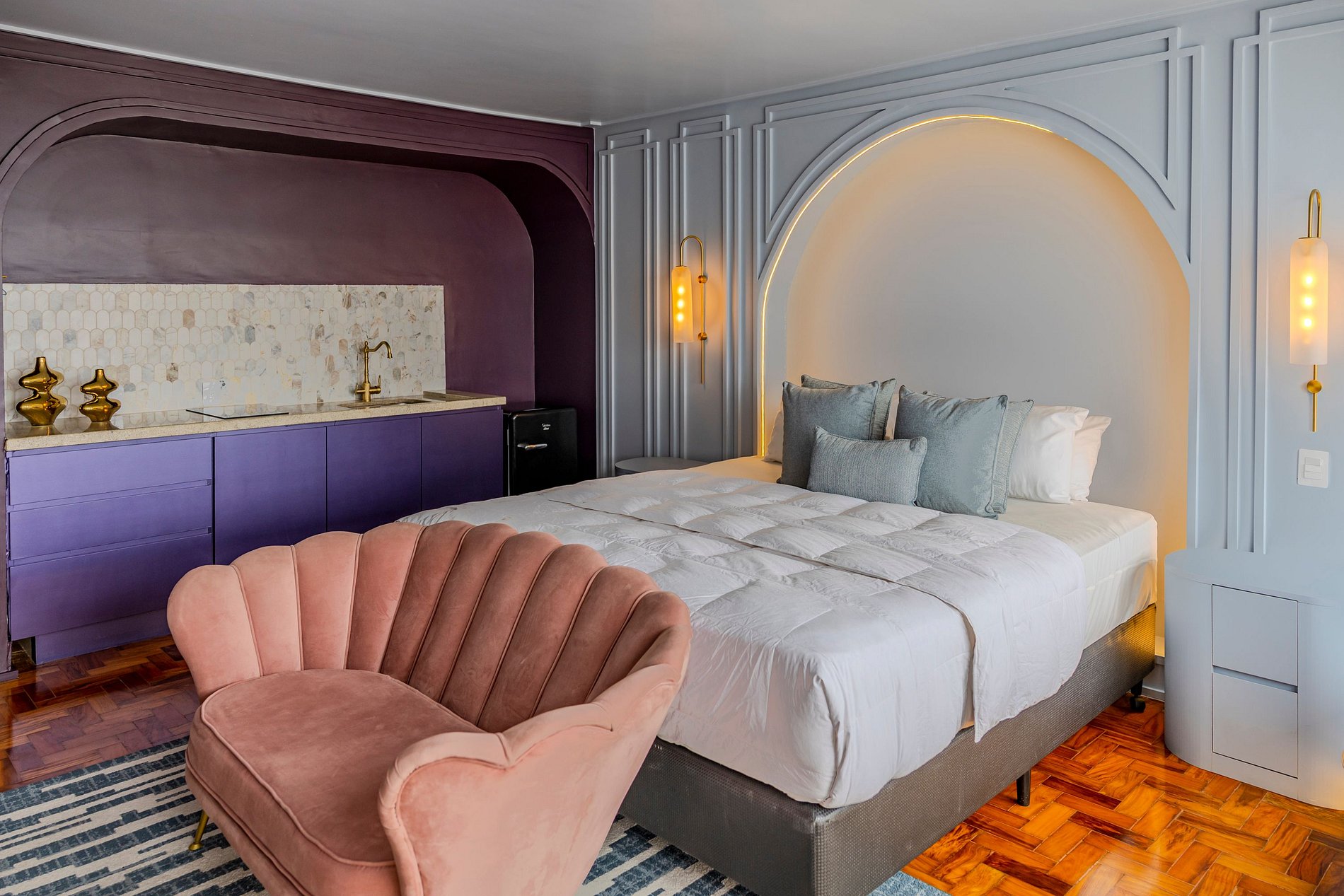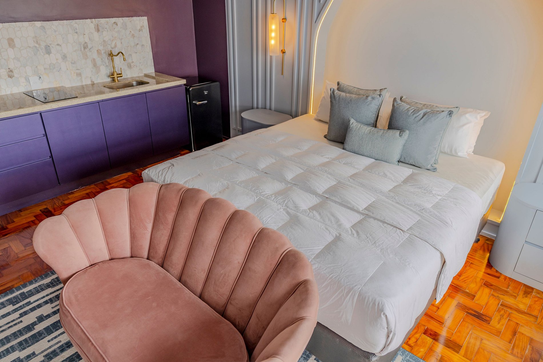 A cama king garante noites confortáveis, e a cozinha compacta vem equipada para quem deseja preparar refeições rápidas sem perder o charme do ambiente. O ar-condicionado e as cortinas blackout asseguram conforto térmico e privacidade total.