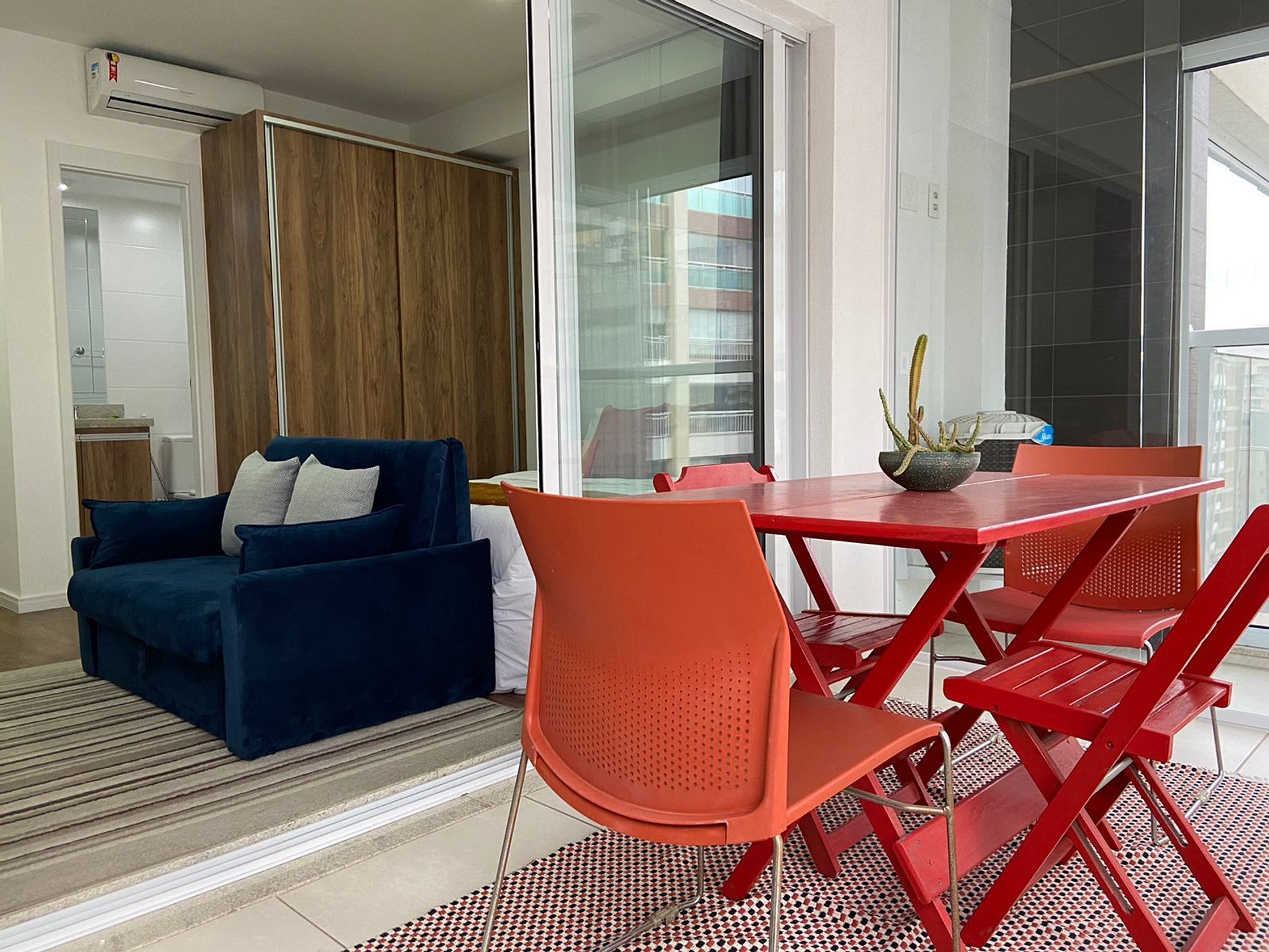 Apartamento confortável, amplo e bem iluminado. Em sua varanda há uma área de para jantar.