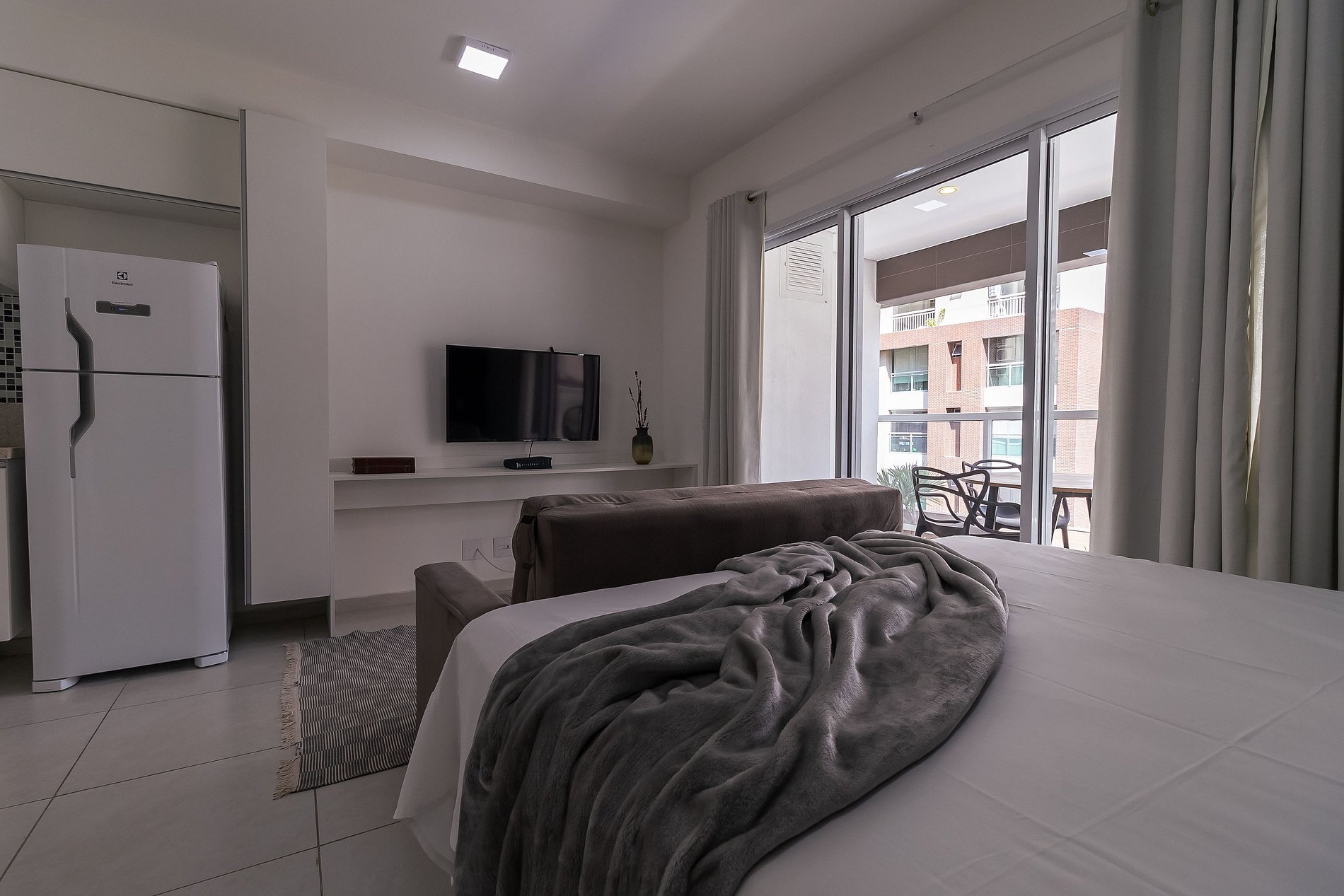 O apartamento conta com fechamento de vidros na varanda e também porta de isolamento no quarto, minimizando ao máximo o potencial barulho.