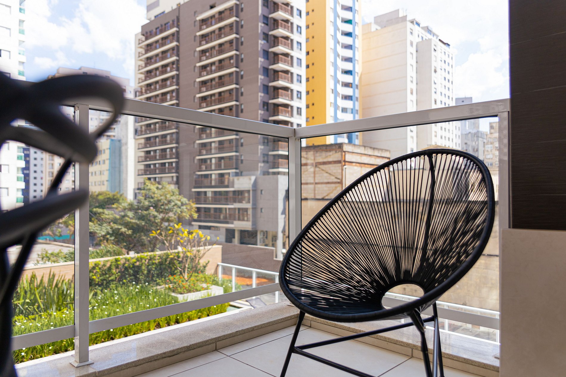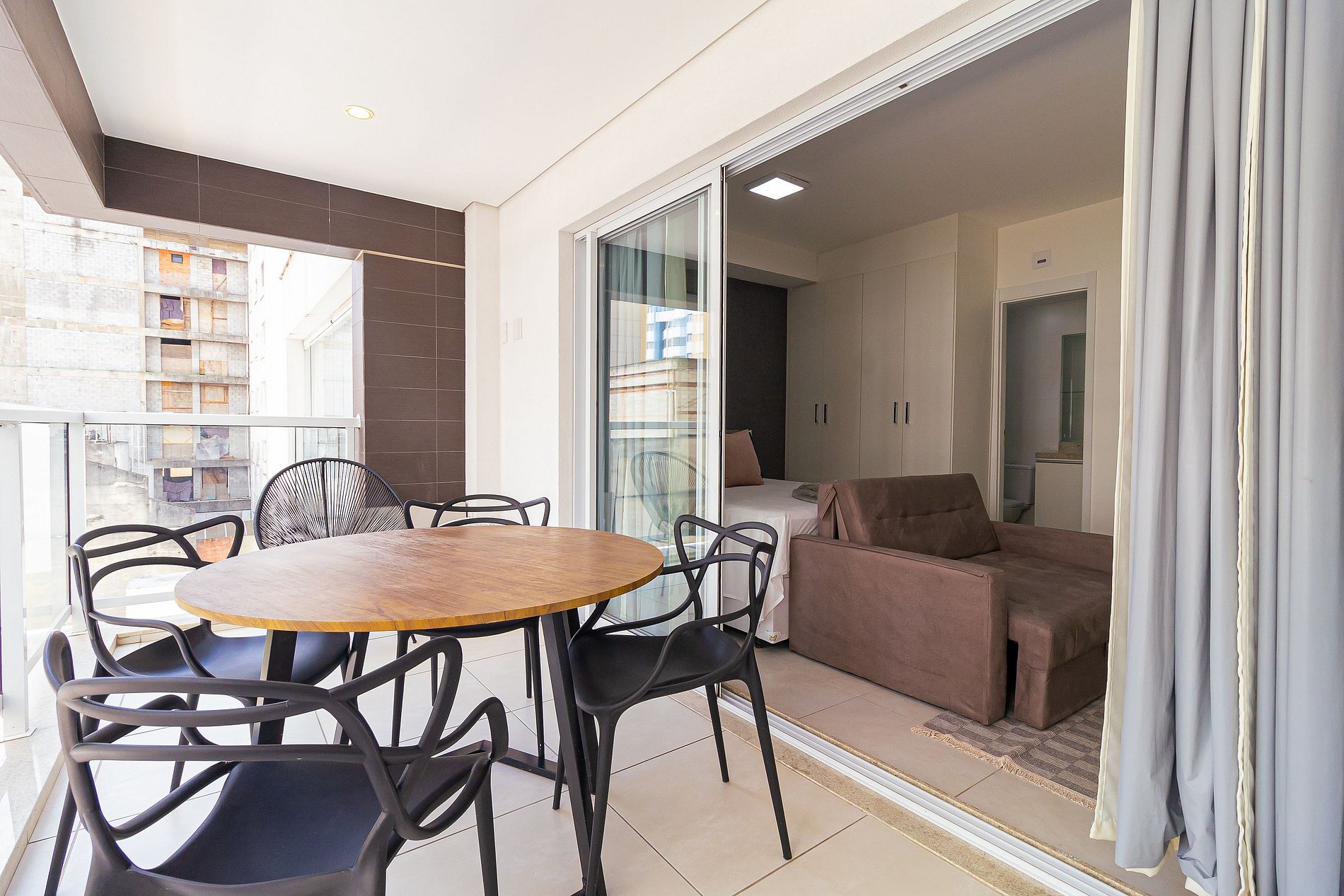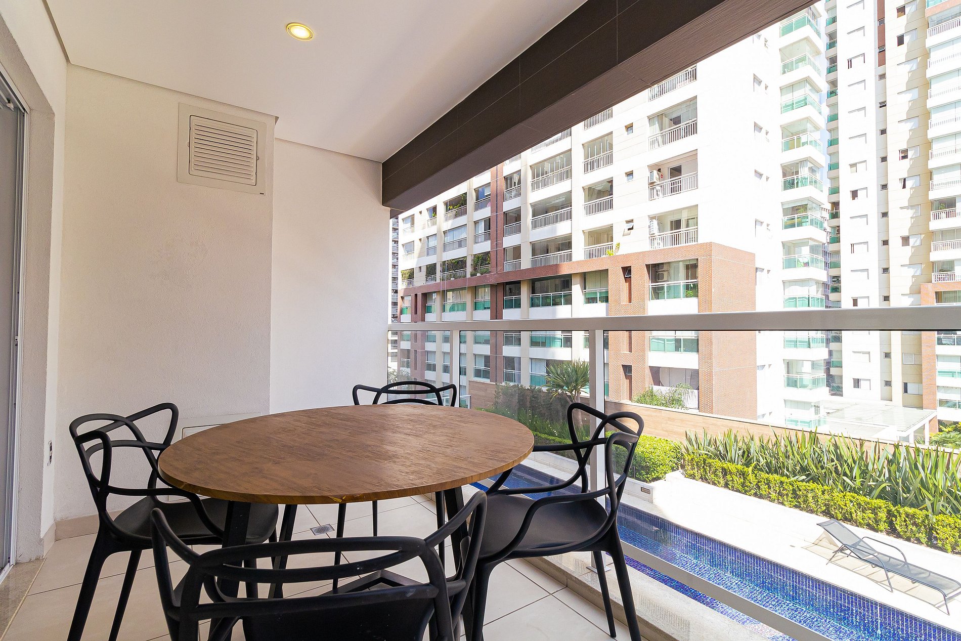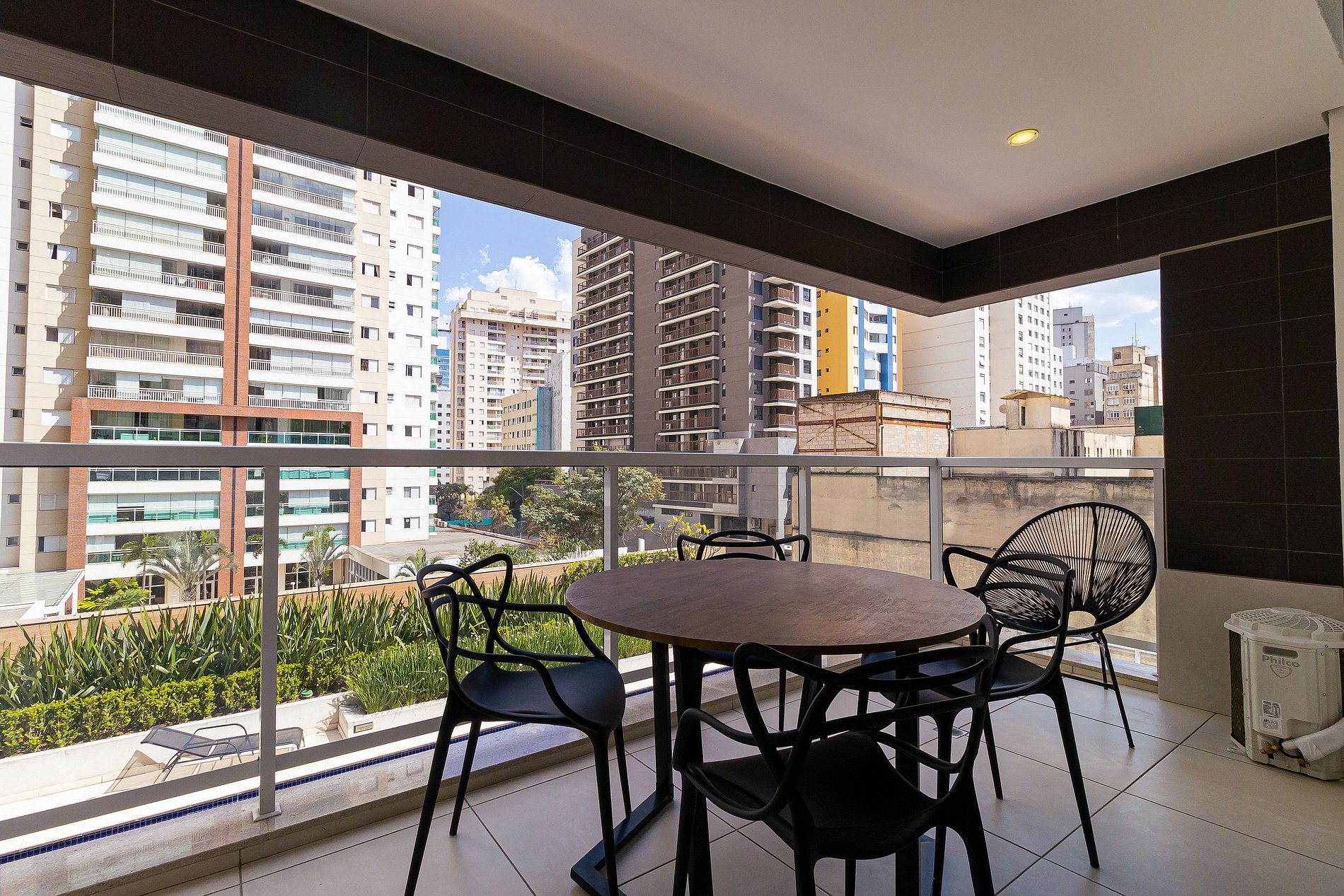 Apartamento confortável, amplo e bem iluminado. Em sua varanda há uma área de para jantar.