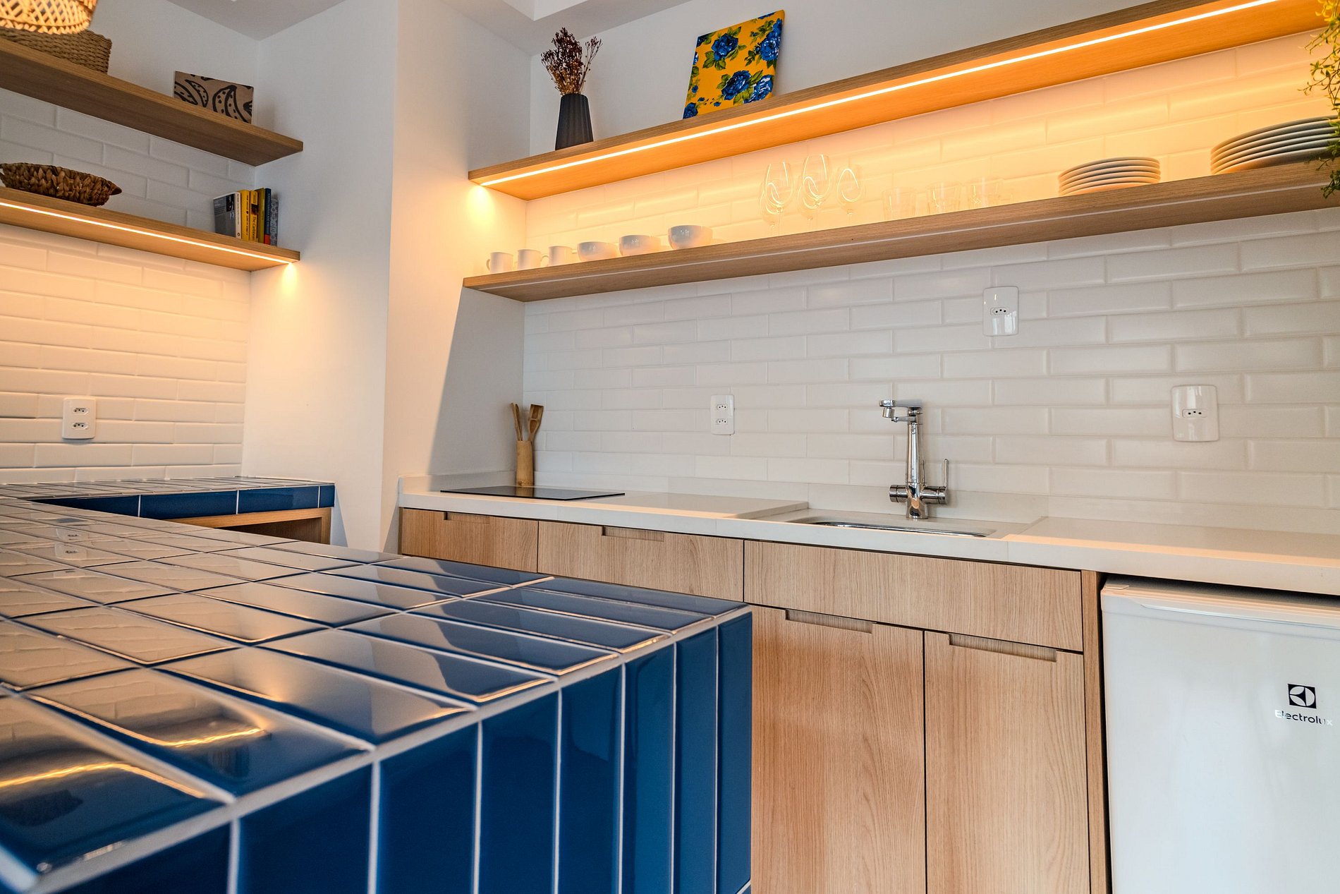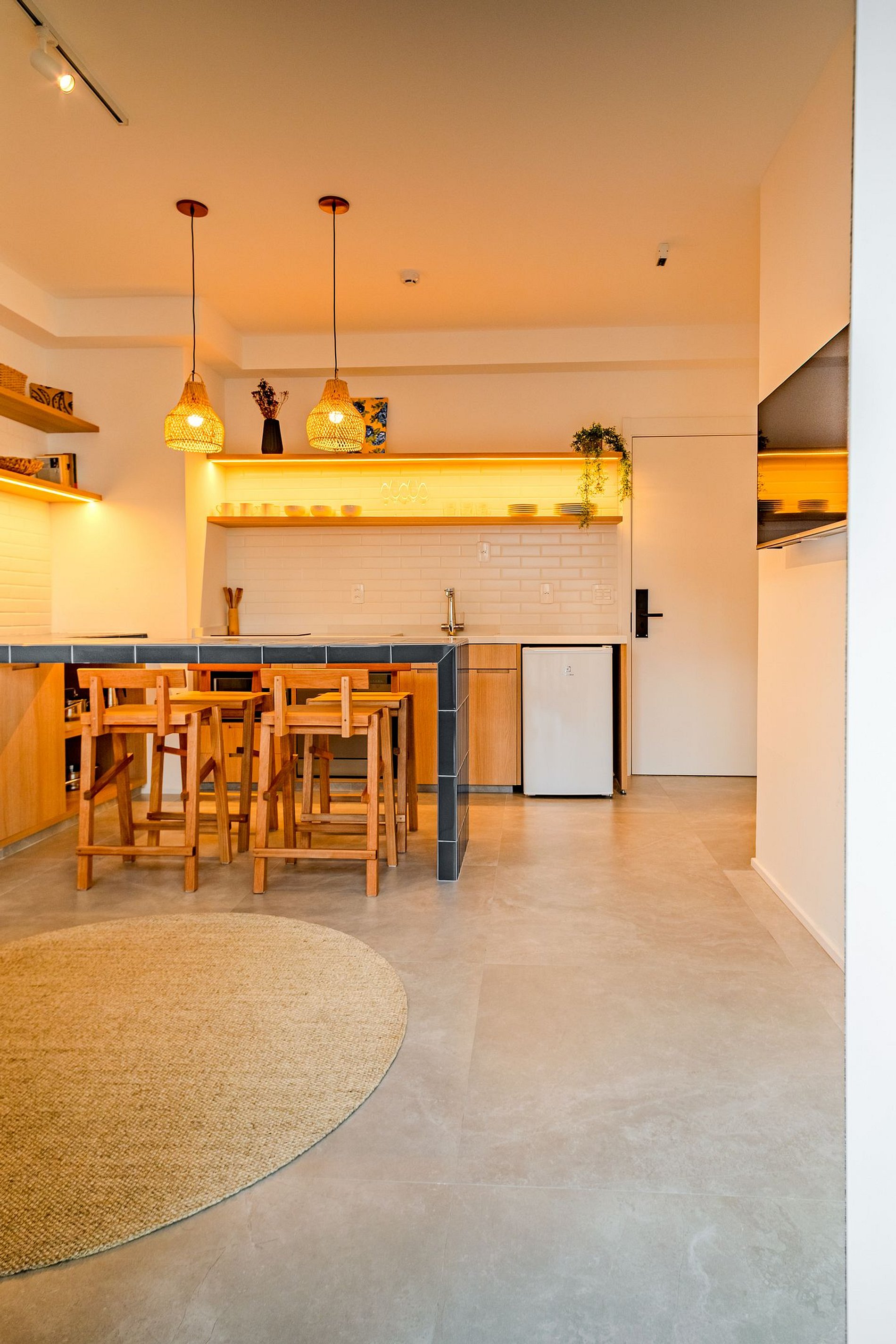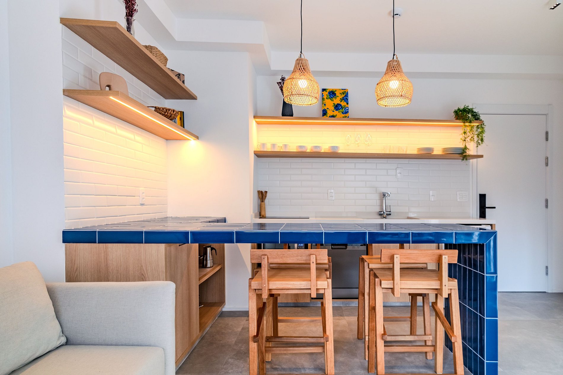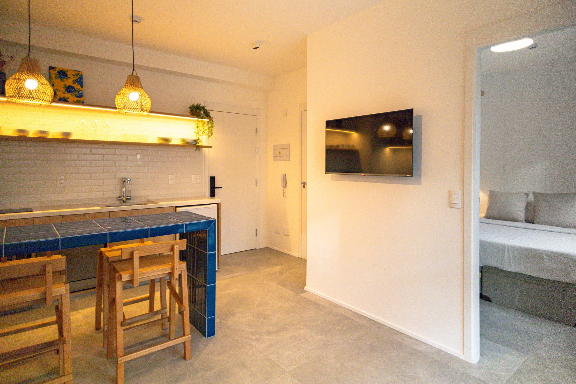 A cozinha é equipada com cooktop, geladeira, utensílios básicos e bancada para refeições rápidas. O banheiro tem acabamento moderno e um chuveiro excelente. Um espaço compacto, moderno e bem resolvido — pronto para te receber!