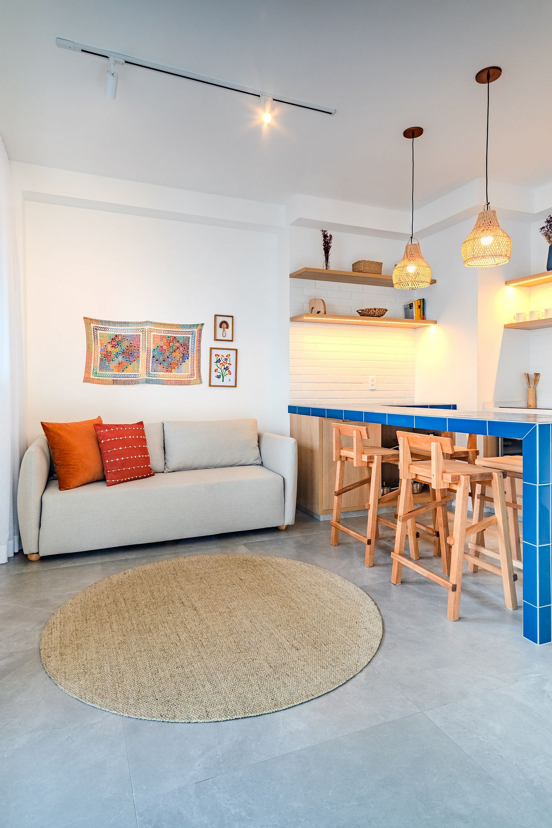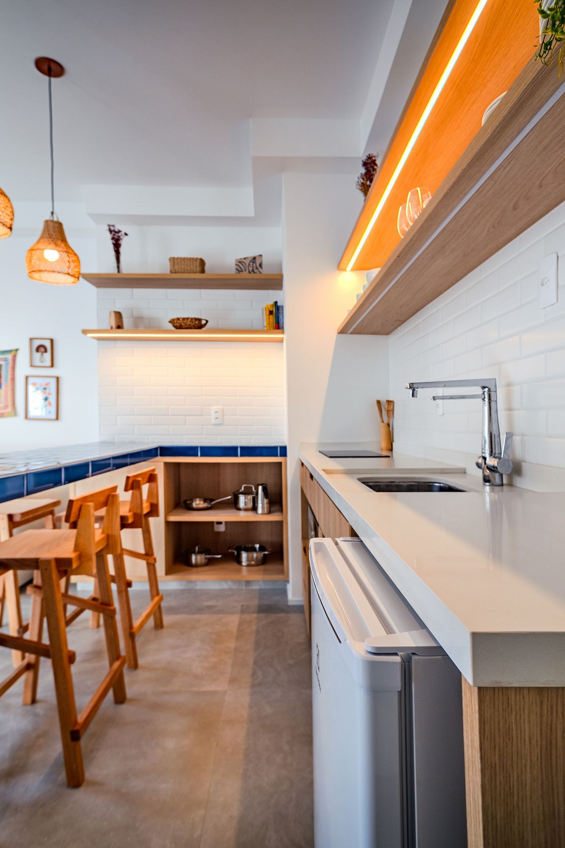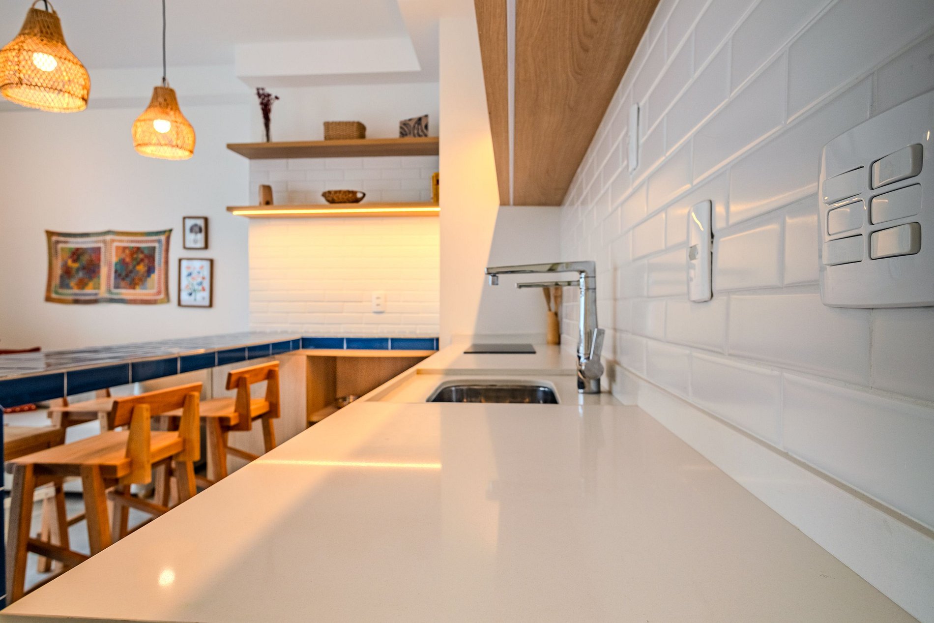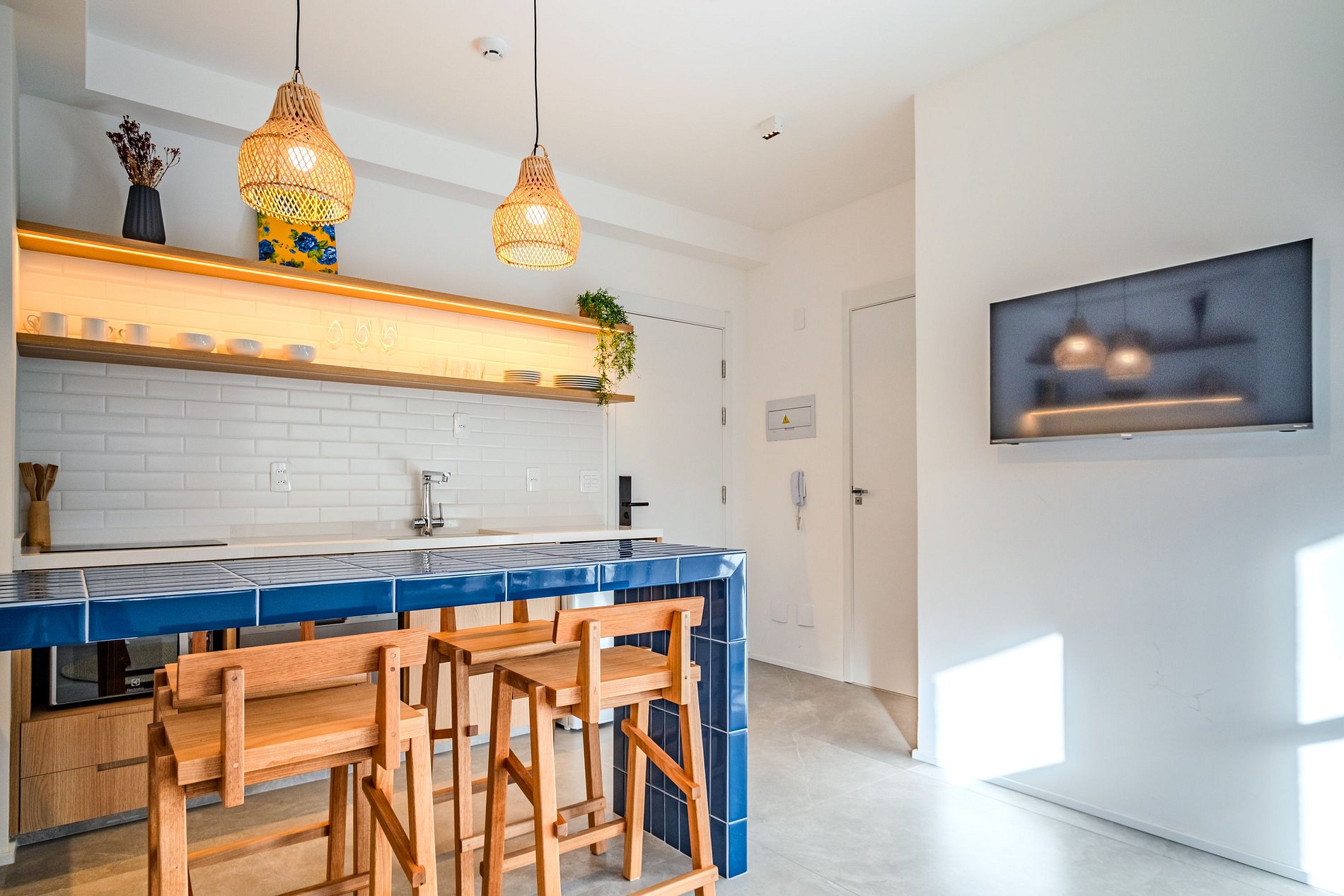 A cozinha é equipada com cooktop, geladeira, utensílios básicos e bancada para refeições rápidas. O banheiro tem acabamento moderno e um chuveiro excelente. Um espaço compacto, moderno e bem resolvido — pronto para te receber!