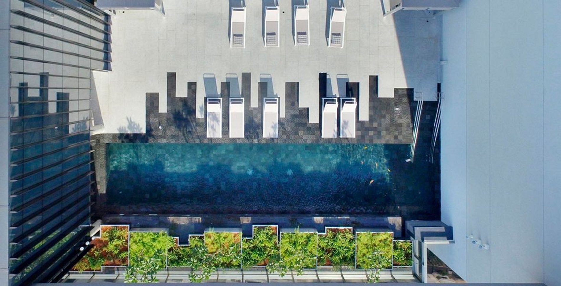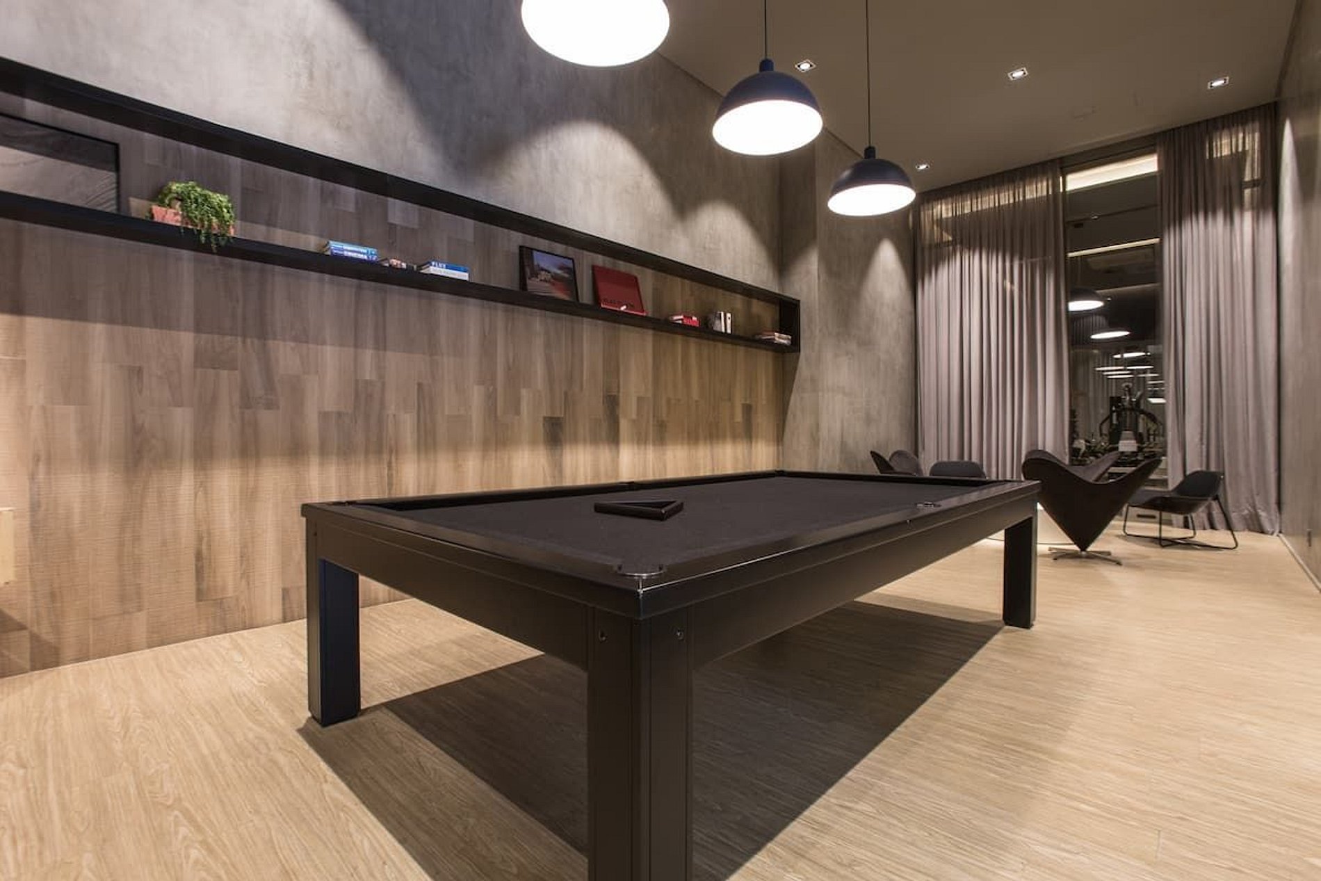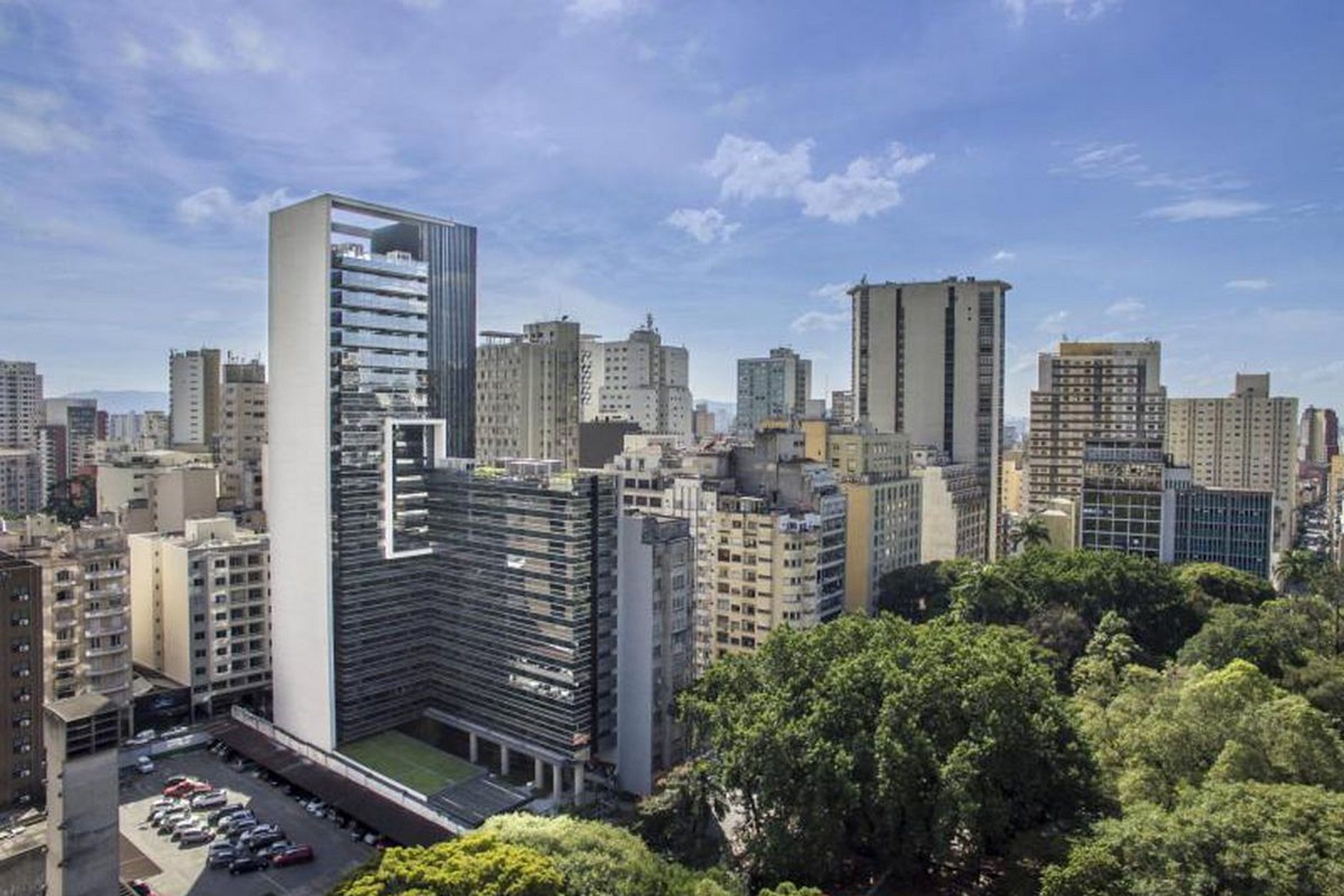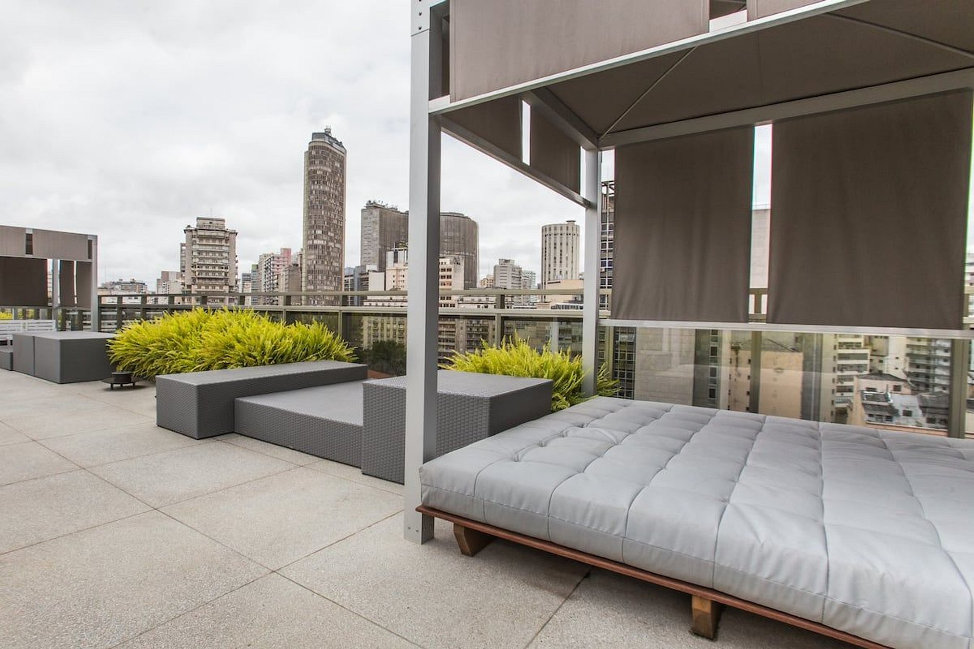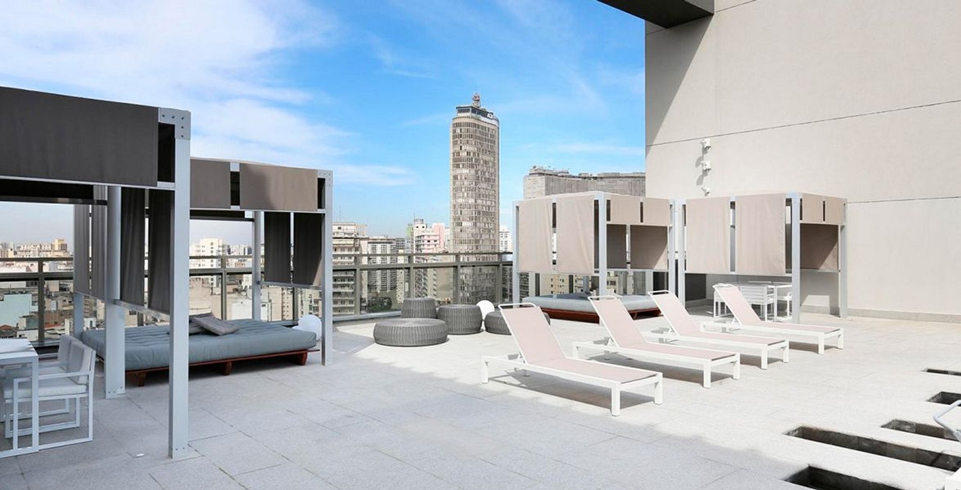 Edifício residencial com lazer completo. Piscina, sauna e academia disponíveis para inquilinos de curta temporada.